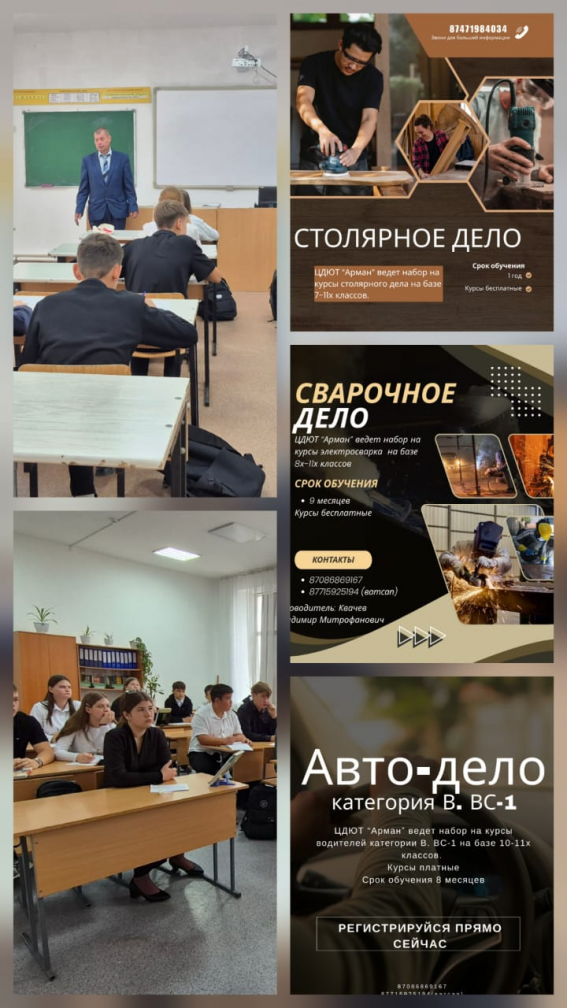 2025 жылдың 9 қыркүйегінде біздің мектепке "Арман" орталығының педагогы В. М. Квачев келді, ол 7-9 сынып оқушыларымен кездесу өткізіп, "ағаш ұстасы", "дәнекерлеу дело" және "Автодело"үйірмелері туралы айтты.