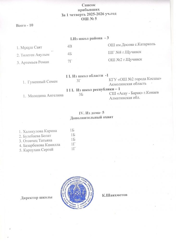 2025-2026 оқу жылының I тоқсанына келгендердің тізімі
