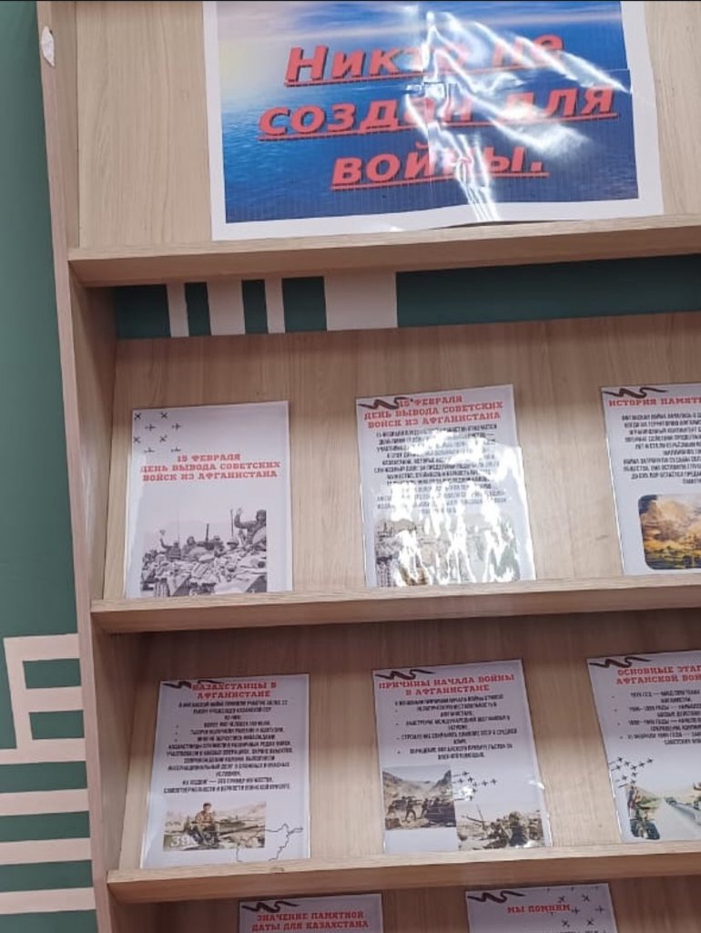 Екінші кабаттын холлында Ауган согысына арналган «Ешкім соыс ушін жаратылмаган» атты кітап кермесі уйымдастырылды. Кермеде согыс тардыры мен адам емірінін куны туралы кітаптар усынылган.