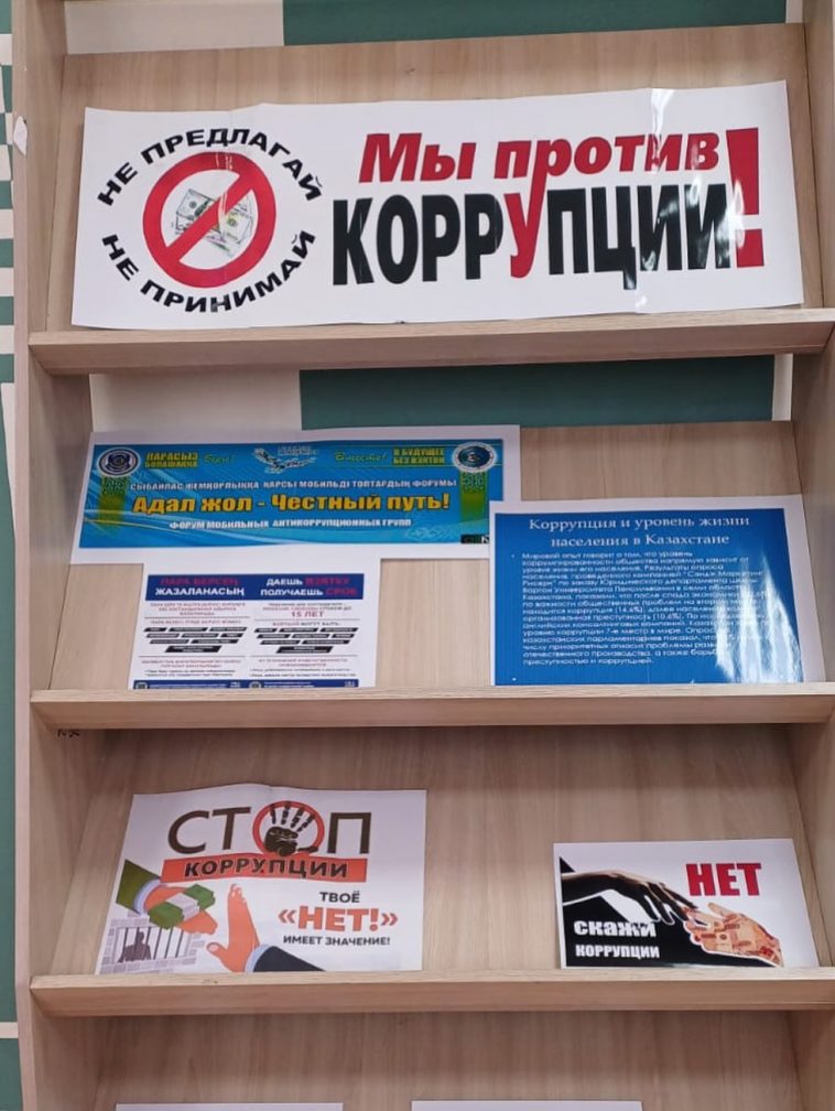 Көрмеге Қазақстандағы сыбайлас жемқорлыққа қарсы саясат, заңдар мен азаматтық жауапкершілік туралы әдебиеттер қойылды.